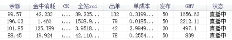 我拿其中4个账号的投放金额和实际的产出对比,给大家看下做个参考。
