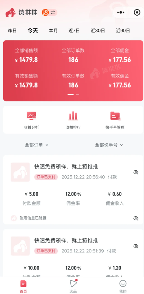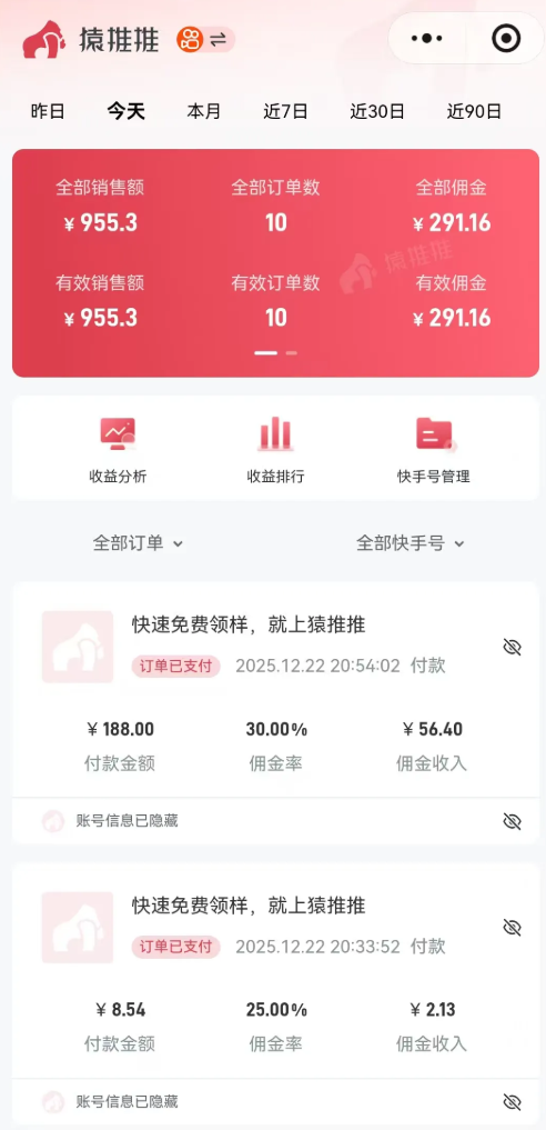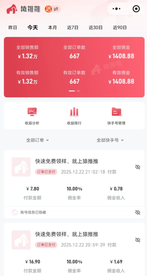 以上是作为本期招募项目的收入展示,日常收入还是很可观的。项目操作原理:通过快手无人直播,引导用户去视频小黄车下单,或者主页进入商品页面,只要别人购买了产品,我们就能拿到一笔佣金。不过,这个玩法我主要走的是微付费投流,利用少量的投入成本来撬动自然流量,从中获得收入。比如:我一个账号每天消耗50元,一般实际佣金能达到100至200,除去成本最差也能赚一半的收入,随着作品发布量积累的越多,到后面投入越来越少,实际收入也会提升。