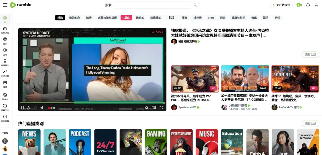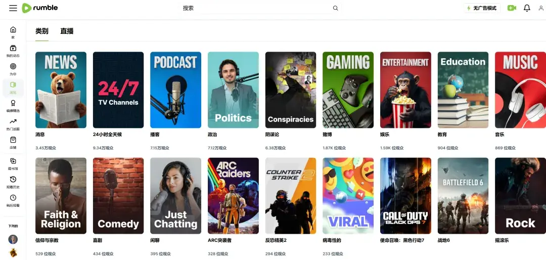 打开是这样的界面,看起来有点简陋,如果你看不懂外语就把页面翻译成中文,RUMBLE媒体平台目前广受欧美人欢迎,我们在传视频的时候也需要贴合其喜好创作,这样流量才好。