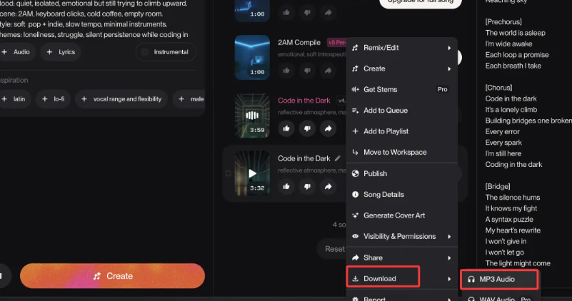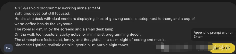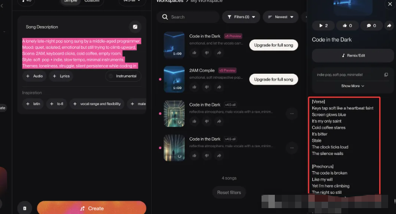 他生成了四首音乐,我这里没法分享给你们,但是它真的是太棒了,它把我内心想要表达的全部表达出来,我已经迫不及待想着,在深夜里,坐在电脑前,听着这个音乐,敲击着代码,喝着咖啡,内心平静而又孤独。哈哈,属于程序员的独角戏。