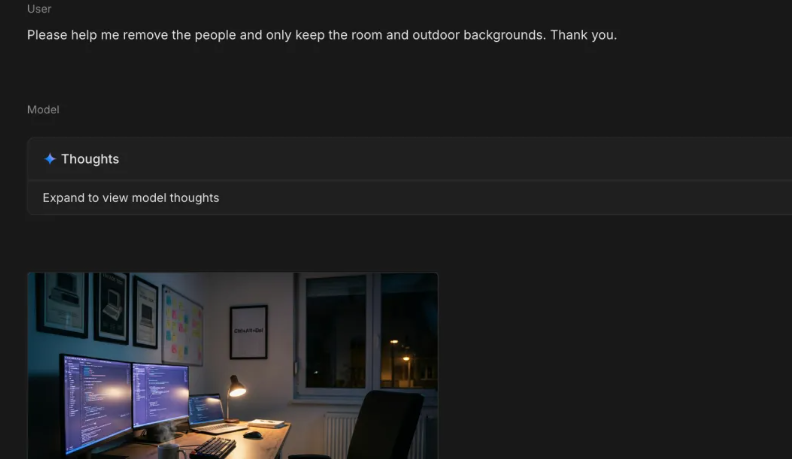 但是 Nano Banana 最酷的地方在于, 对吧? 假设我只想保留房间和外面的背景, 而不要人物。我可以 让 Nano Banana 把他们移除, 它就会照做。