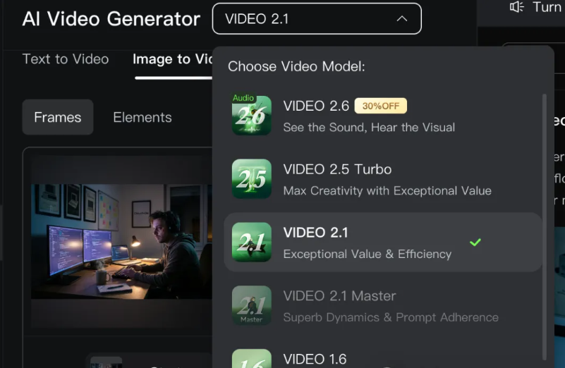 登录后, 只需点击制作视频,然后将工具版本设置为2.1。